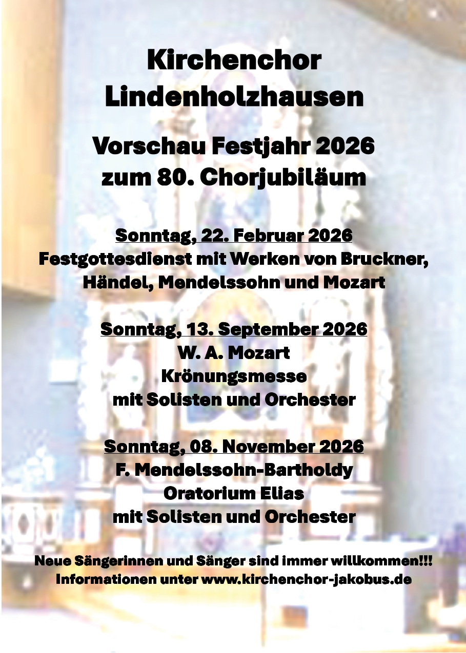 Nachdem das 75. Chorjubiläum 2021 pandemiebedingt nicht stattfinden konnte, feiert der Kirchenchor St. Jakobus Lindenholzhausen 2026 sein 80. Chorjubiläum.